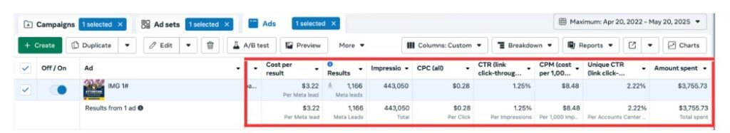 Results 1,166 leads generated Cost per lead: $3.22 443,050 impressions CTR (Link): 1.25% CPC: $0.28 Total spend: ~$3,755